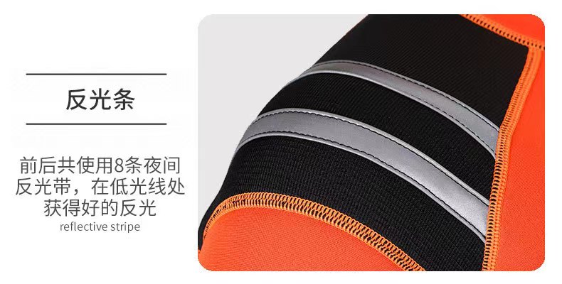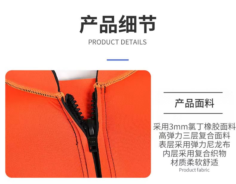 1、有3mm厚度,氯丁胶面料、弹性的氯丁橡胶材质前置有拉链,穿戴方便;膝盖肘部立体裁剪,使四肢灵活;