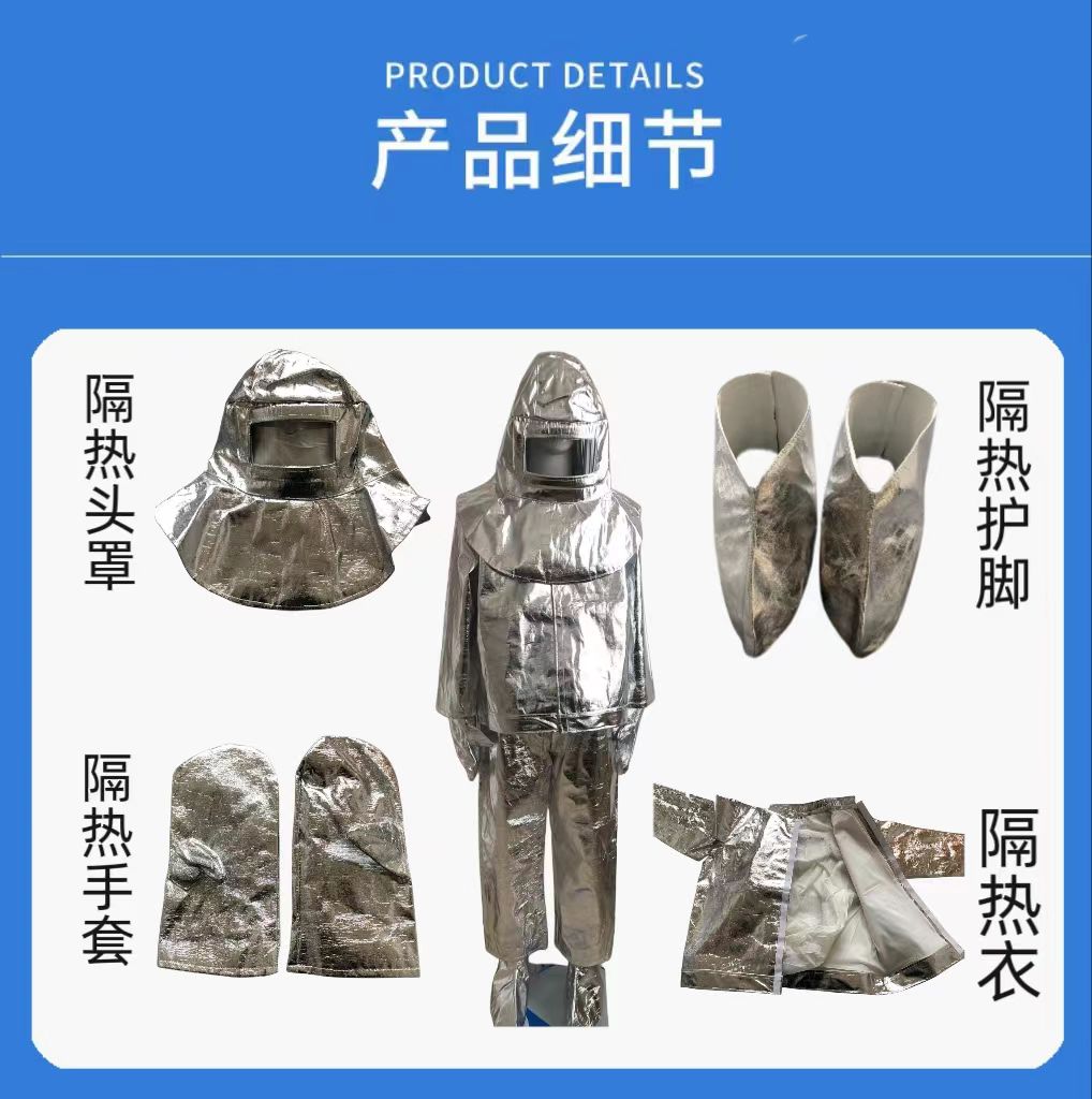 用途:用于热辐射场所的全身防护,它有抗辐射,耐G温、质轻柔软、防水等性能。它可在500度热辐射下、近火场G温区。